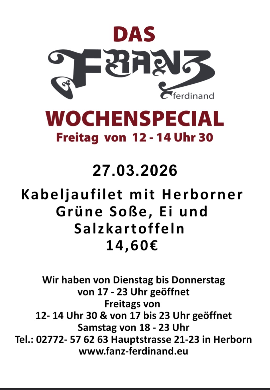 Freitags gibt es auch im Franz Ferdinand Mittagstisch zum mitnehmen oder gemütlich direkt   vor Ort essen.